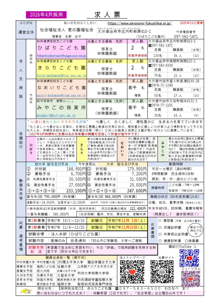 | 幼保連携型認定こども園 ひばりこども園 | 保育士・幼稚園教諭(養護・小教諭も可)2026年度3名程度、2027年度4名程度(AKANO採用予定者含む) 〒879-5421 由布市庄内町柿原410-1 ☎097-582-1471 |